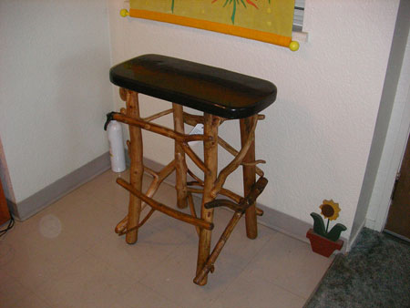 When the economy started south in ’07 I got the idea to try to add to our income by making rustic furniture and selling it at local craft fairs here.  We have our own style and make benches, chairs, coat-racks, end or coffee or chair side tables, footstools, freestanding shelves and do custom orders.  We’re currently working on an all-manzanita queen bed that goes to a Tahoe home.  We use manzanita (Little Apple), Oaks, Pines, Locust, Maple, Cherry, Laurels, Sycamore, Cedar, Hawthorne and Crepe Myrtle.  We use about every wood you can find here in the foothills.  A chair will normally have 12-14 different woods in it.