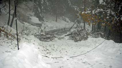 The leaves are still on the trees and the snow is very wet, resulting in trees and tree limbs coming down all over the forest.