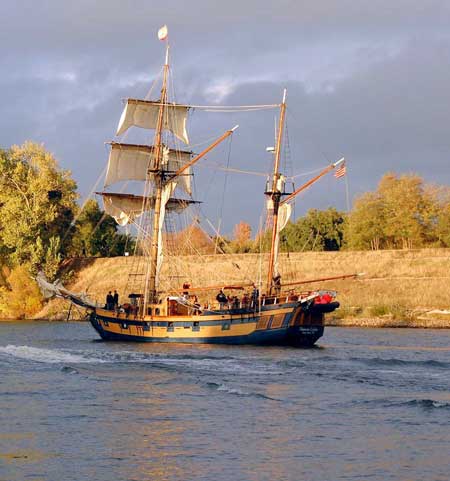 The Mexican Government surely became concerned about the interlopers ferreting around in their territory and it is believed that this is what led them to grant John Sutter his vast tract at the confluence of the Sacramento and American Rivers. One of Sutter’s boats was the schooner Isabella which legend has it had been the private yacht of King Kamehameha the Great of the Sandwich Islands, possibly the first yacht in the Delta! Leaving what is now San Francisco in August of 1839 it took Sutter and his band eight days to find the entrance to the Sacramento after passing through Carquinez Straits which speaks to the maze of waterways even then. Sutter eventually landed on the bank of the American River at about where the city dump of Sacramento is located. He built his fort nearby at what is now the corner of 27th and L streets in Sacramento. Sutter became a Mexican citizen on August 29, 1840 and was appointed Captain in the Mexican Army as well as judge and representative of the “Government at the Frontier of the Rio Sacramento”. Sutter’s treatment of the Indians is a matter of controversy. Certainly he treated them no worse than did the Mexicans or the Spanish before them. What is known is that he minted tin coins with stars stamped into them for payment to the Indians for work performed and the coins could be redeemed later for food or dry goods in Sutter’s store.