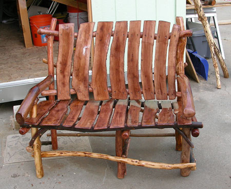 When the economy started south in ’07 I got the idea to try to add to our income by making rustic furniture and selling it at local craft fairs here.  We have our own style and make benches, chairs, coat-racks, end or coffee or chair side tables, footstools, freestanding shelves and do custom orders.  We’re currently working on an all-manzanita queen bed that goes to a Tahoe home.  We use manzanita (Little Apple), Oaks, Pines, Locust, Maple, Cherry, Laurels, Sycamore, Cedar, Hawthorne and Crepe Myrtle.  We use about every wood you can find here in the foothills.  A chair will normally have 12-14 different woods in it.