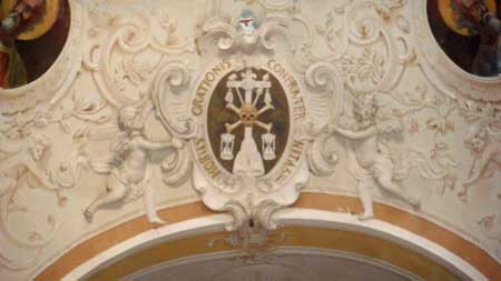 After wandering a bit we came to the main church in town, Church of Saint John the Baptist. It is built of black and white Italian marble in a Romanesque style, and next to it the Oratory of the Dead (also black and white) this was built by a brotherhood of good works, like a Rotary Club called “confraternities”. The town had two, the black and the white. This building was the oratory of the Black group, and their good work consisted of arranging funerals, taking care of widows, orphans and the shipwrecked. Here is their symbol, a skull, crossbones and an hourglass…death awaits us all… (nice huh?)