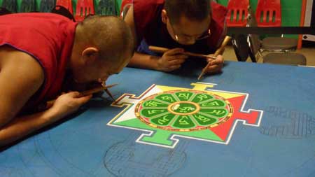 According to Buddhist scripture, sand mandalas transmit positive energies to the environment and to the people who view them. While constructing a mandala, Buddhist monks chant and meditate to invoke the divine energies of the deities residing within the mandala. The monks then ask for the deities’ healing blessings.